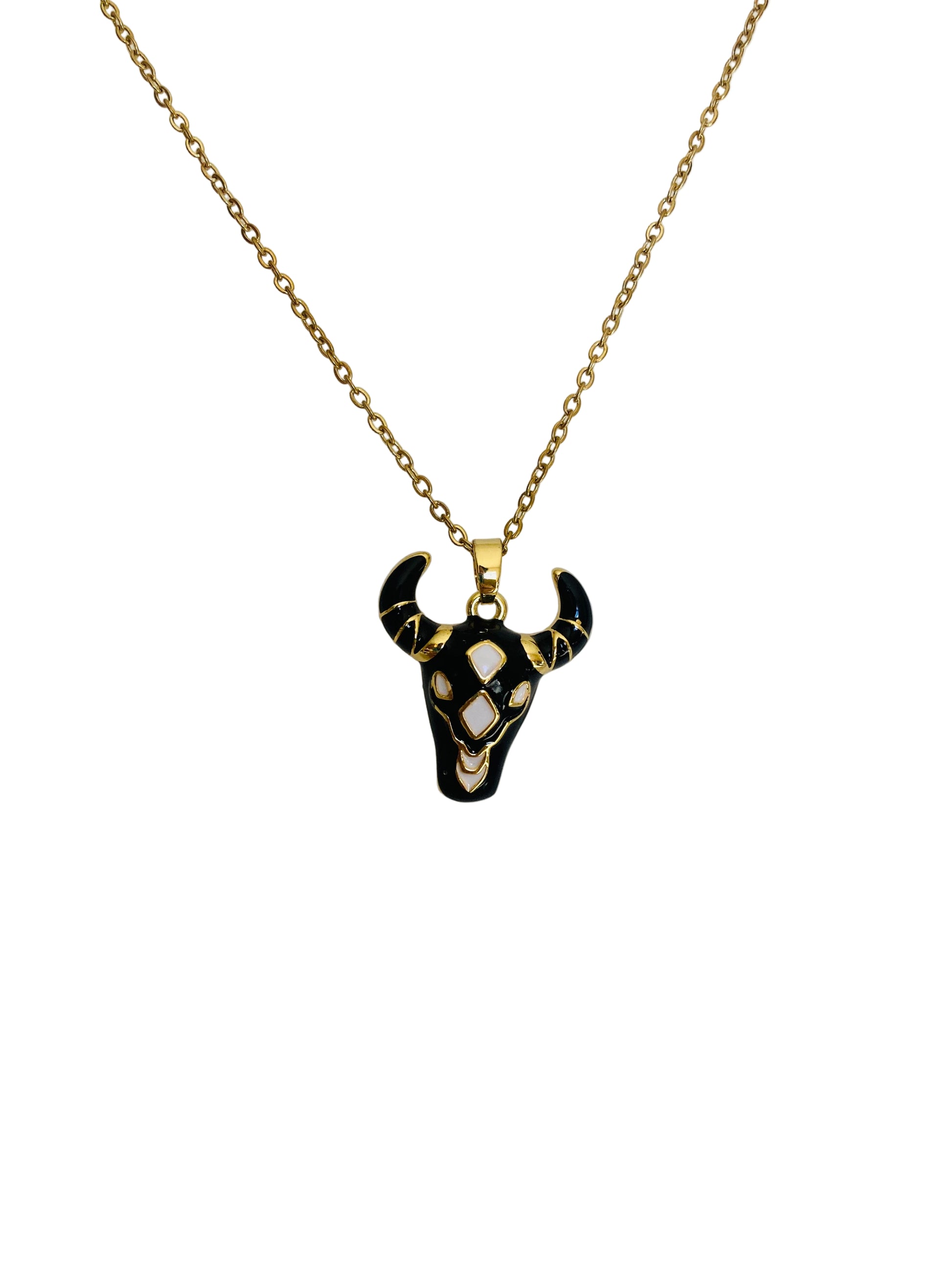Collar con toro dimensión dije alto 2.5 cm en color negro en material chapa y cadena acero inoxidable.
